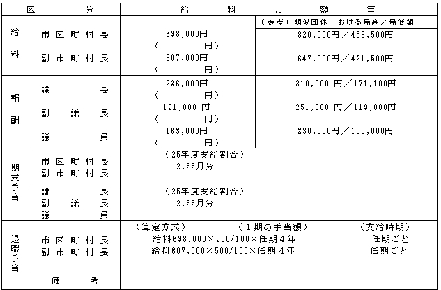 特別職の報酬等の状況 トップ>特別職の報酬等の状況 ページID:1078 掲載日 : 2014/04/30 更新日 : 2015/07/07 特別職の報酬等の状況(26年4月1日現在) (注)1 給料及び報酬の( )内は、減額措置を行う前の金額である。2 退職手当の「1期の手当額」は、4月1日現在の給料月額及び支給率に基づき、1期(4年=48月)勤めた場合における退職手当の見込額である。 このページに関するお問い合わせ 総務課 電話:0887-32-1212 お問い合わせはこちら
