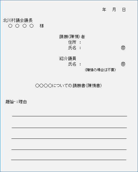 行政などに対し意見や要望があるときは、請願書や陳情書を議会に提出することができます。