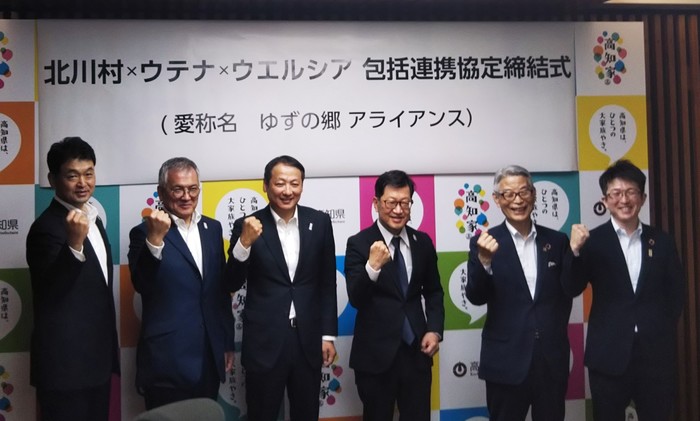 このたび北川村は、化粧品メーカーの株式会社ウテナ(東京都)及びドラッグストアのウエルシアグループ(東京都/ウエルシア薬局株式会社、高知県/株式会社よどや)との3者での包括連携協定を締結いたしました。