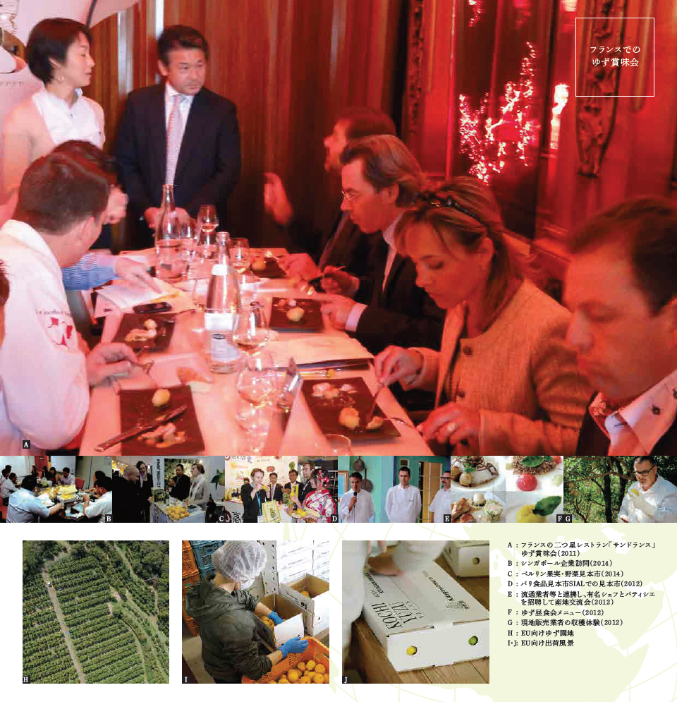 2010年シンガポールの食品展示会(FHA)を皮切りに、翌11年フランスのパリの二つ星レストランでゆず試食会を開催。現地のシェフやパティシエなどが参加し、レモンやオレンジとも異なる上品な芳香に海外の料理人たちも魅了されました。そして「丸ごとの生のゆず玉が欲しい」と要請があり、EU輸出のための整備が進められました。